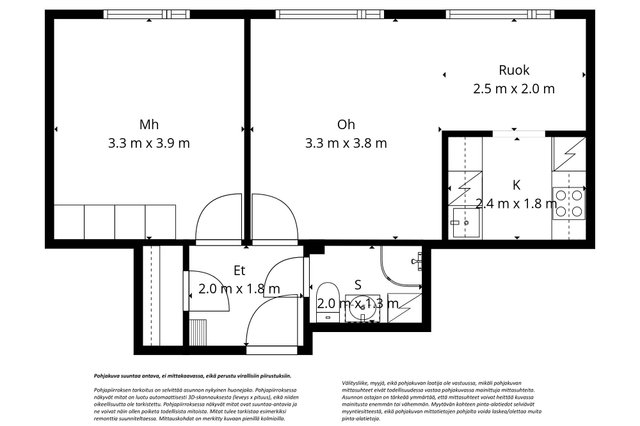 - Huoneiston pinta-ala on yhtiöjärjestyksen, isännöitsijäntodistuksen ja myyjän ilmoituksen mukaan 43,5 m2. Pinta-alaa ei ole tarkistusmitattu. Edellä mainittu pinta-ala saattaa tämän ikäisessä kohteessa poiketa olennaisestikin huoneiston nykyisen ja rakentamisaikaisen mittaustapojen ja standardien mukaan laskettavasta pinta-alasta. Huoneiston todellinen pinta-ala voi siis olla yhtiöjärjestyksessä, isännöitsijäntodistuksessa ja esitteessä mainittua pienempi tai suurempi.