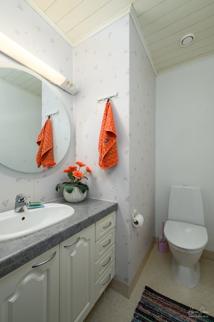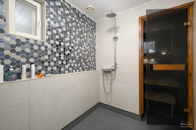 Talossa on kaksi erillistä wc:tä, mikä helpottaa arkea suuremmankin porukan kanssa. Pesuhuone ja sauna on remontoitu tyylikkäästi noin neljä vuotta sitten, ja ne tarjoavat rentouttavat puitteet arjen kiireiden keskellä. Kodinhoitohuoneessa on oma uloskäynti, mikä tekee pyykkihuollosta ja arjen askareista sujuvampaa.