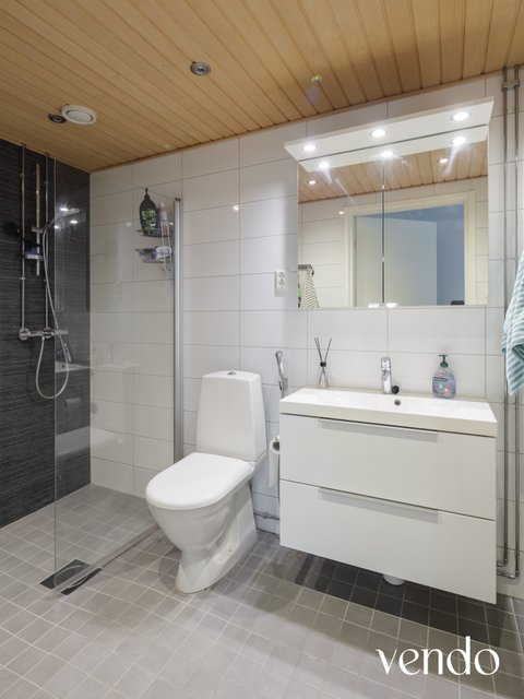 - WC-istuin, suihku, suihkuseinä, pesukoneliitäntä, lattialämmitys, peilikaappi, pesuallas, allaskaappi, ja bidee-suihku