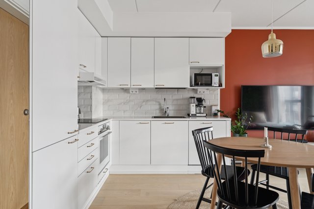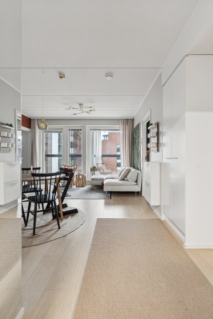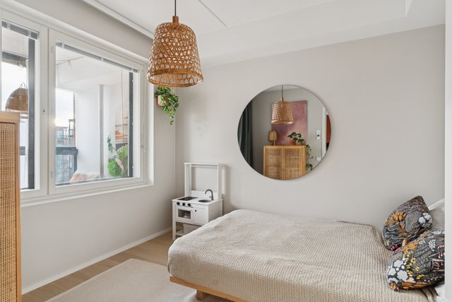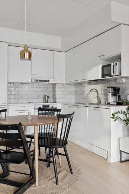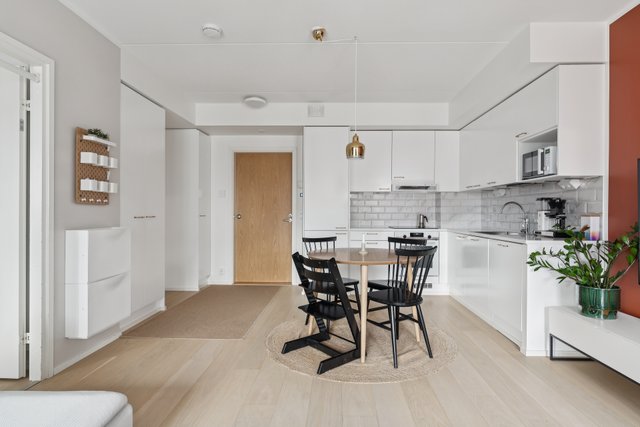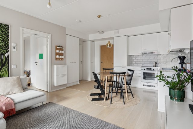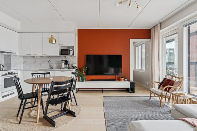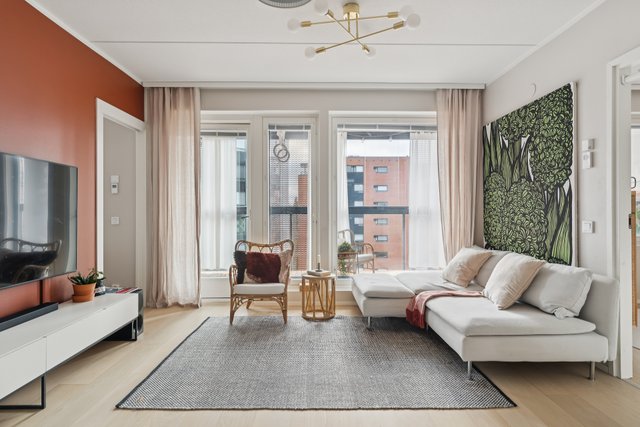 Heti ovelta huomaat tilantunnun yllättävän positiivisesti. Tämä valoisa kolmio tuntuu neliöitään suuremmalta ja tarjoaa erinomaiset puitteet arkeen sekä etätyöhön.