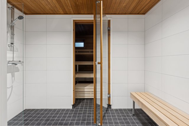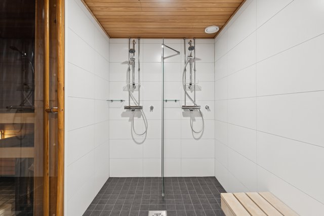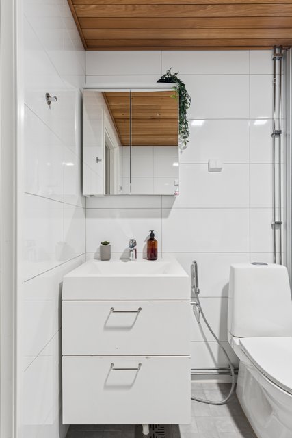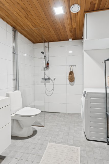 - WC-istuin, suihku, suihkuseinä, allaskaappi, peilikaappi, pesukoneliitäntä, ja lattialämmitys
