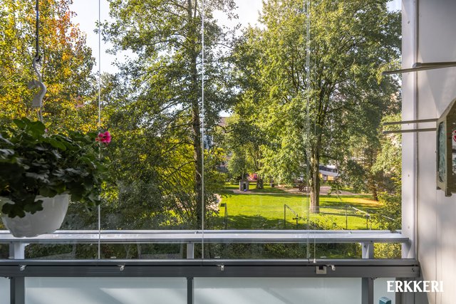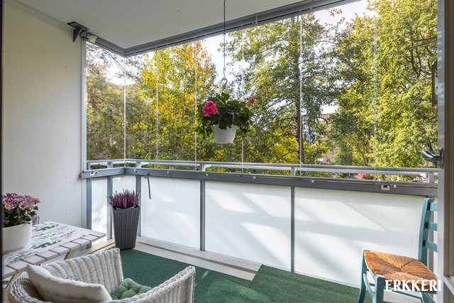 Huoneet ovat tilavia ja helposti kalustettavia, mikä tekee kodin sisustamisesta vaivatonta. Olohuoneesta avautuu kulku suurelle lasitetulle länsiparvekkeelle, joka toimii viihtyisänä lisähuoneena pitkälle syksyyn.