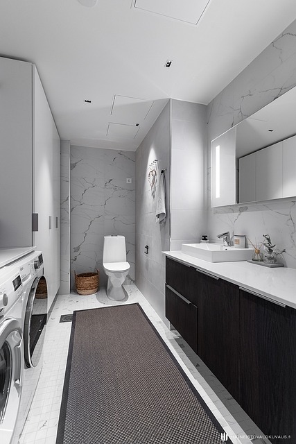 - Lattialämmitys, pesukoneliitäntä, suihkuseinä, wc-istuin, allaskaappi, peili, suihku, ja kiinteät valaisimet