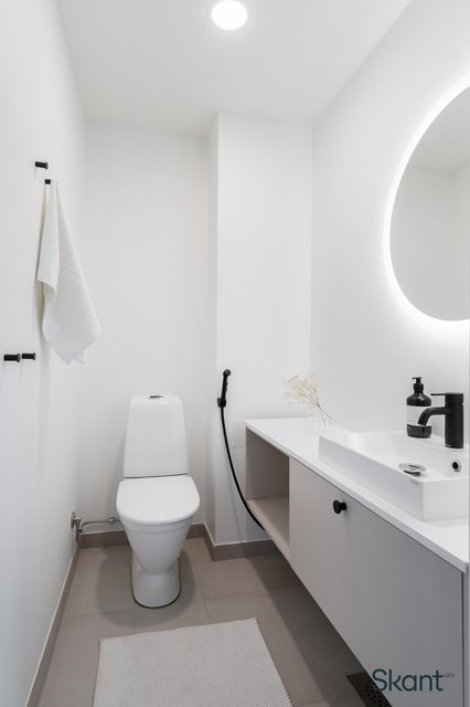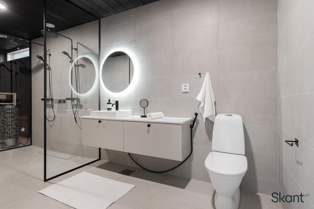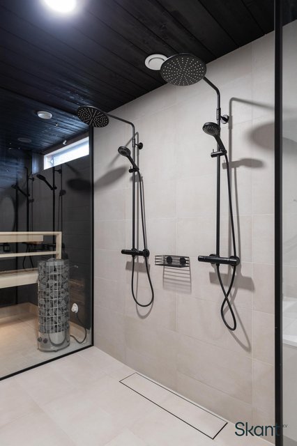 - WC-istuin, suihku (x2 Damixa sadesuihku), suihkuseinä, peili (valopeili), pesuallas, bidee-suihku, lattialämmitys, allaskaappi, ja linjalattiakaivo