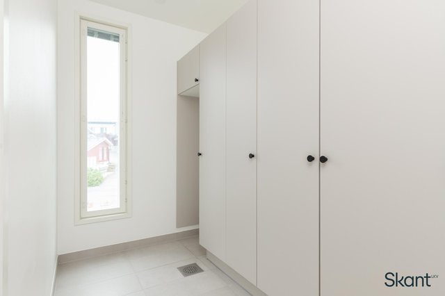 - Pesukoneliitäntä, tila pesutornille, lattiakaivo, pyykkikaapit, ja lattialämmitys