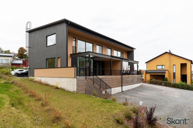 Tämä arkkitehdin suunnittelema kahden kerroksen koti hurmaa modernilla ilmeellään, korkealla huonekorkeudellaan ja suurilla ikkunoillaan, jotka tuovat sisään runsaasti luonnonvaloa. Avarat ja valoisat oleskelutilat, laadukkaat materiaalivalinnat sekä harkitut yksityiskohdat tekevät tästä kodista sekä viihtyisän että arjessa toimivan. Harmoninen ja maanläheinen värimaailma luo kotiin lämpimän ja rauhallisen tunnelman.