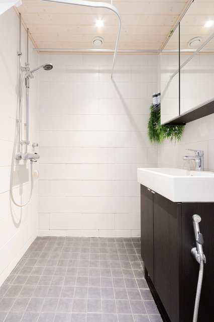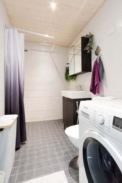 - WC-istuin, suihku, pesukoneliitäntä, lattialämmitys, pesuallas, bidee-suihku, ja allaskaappi