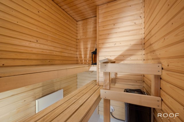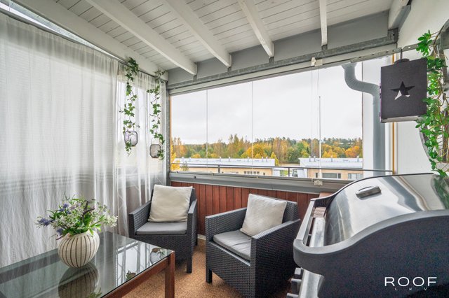 Lasitettu parveke toimii kuin lisähuone keväästä pitkälle syksyyn – täydellinen paikka nauttia aamukahvista, lukemisesta tai rentoutumisesta auringonlaskussa. Ja mikä parasta: oma sauna tuo arkeen pientä ylellisyyttä – löylyt silloin kun sinulle sopii.