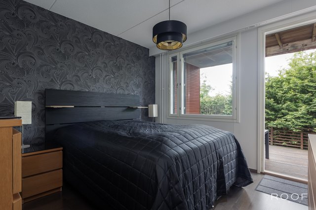 - Asunnossa on kaksi makuuhuonetta, mutta ruokailutilasta saat tarvittaessa ylimääräisen huoneen. Toisesta makuuhuoneesta on käynti isolle terassille. Molemmissa on parkettilattia ja seinät maalattu/tapetti.