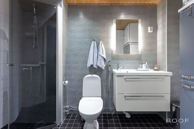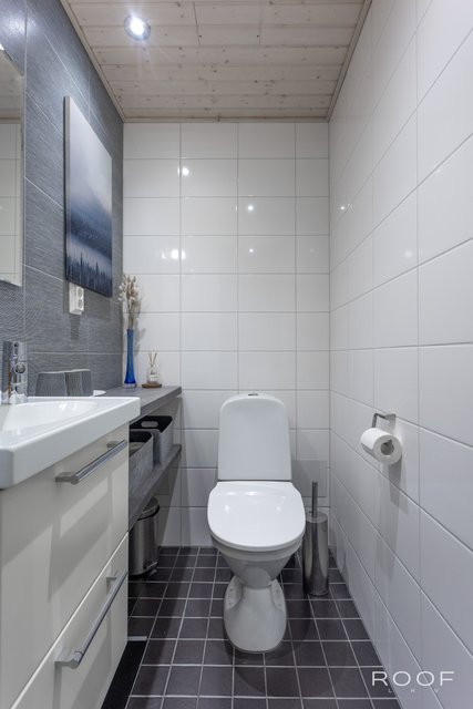 - Alakerran kylpyhuoneen yhteydessä on erillinen wc. Varustus: wc-istuin, allaskaapisto, peili, bidee-suihku, lattialämmitys, työtaso. Koko tila on laatoitettu.