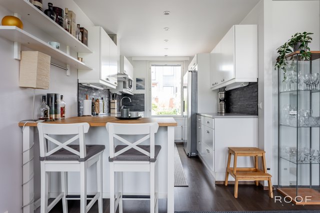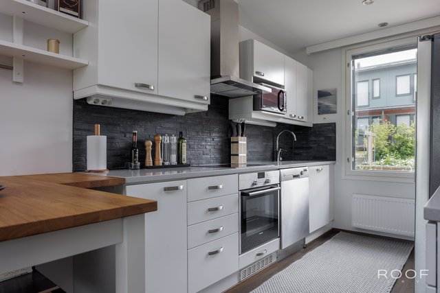 - Tyylikäs ja hyväkuntoinen avokeittiö. Varustus: jääkaappi ja pakastin, keraaminen liesi, erillisuuni, astianpesukone, liesituuletin. Työtaso kiveä. Lattia parkettia ja seinät maalattu/laatta.
