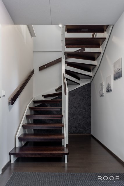 - Ruokailutila, joka on muutettavissa makuuhuoneeksi. Eteisessä on koko seinän pituinen liukuovikaapisto. Alakerran aulatilassa on liukuovikaapisto ja tilava lämmin varasto.