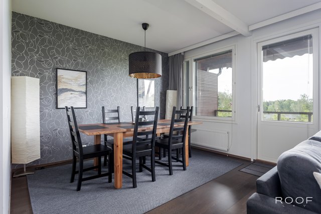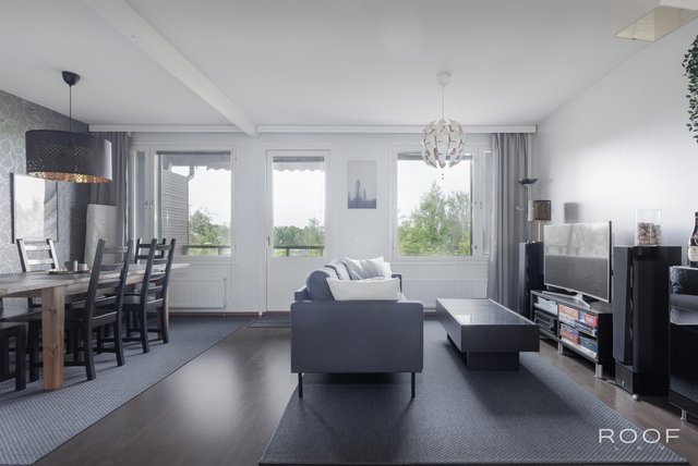 - Tilava olohuone, josta on käynti eteläparvekkeelle. Lattia parkettia ja seinät maalattu. Kauniit näkymät kattojen yli laaksoon.