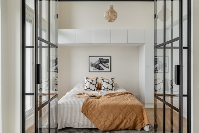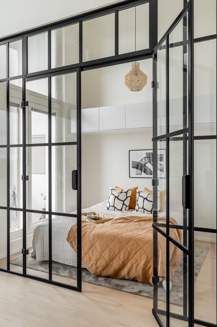 – Tyylikäs lasiseinä makuuhuoneessa tuo modernia ilmettä ja päästää luonnonvalon virtaamaan