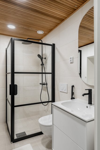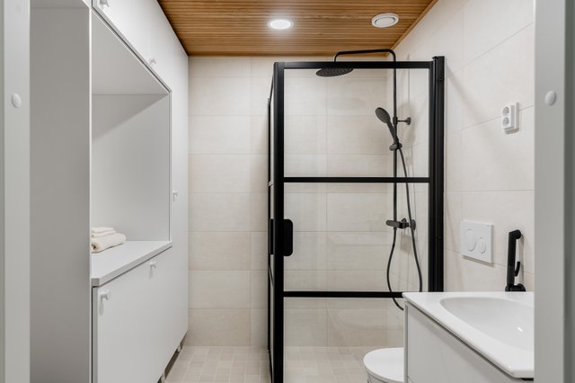 - WC-istuin, suihku, pesukoneliitäntä, lattialämmitys, ja suihkukaappi