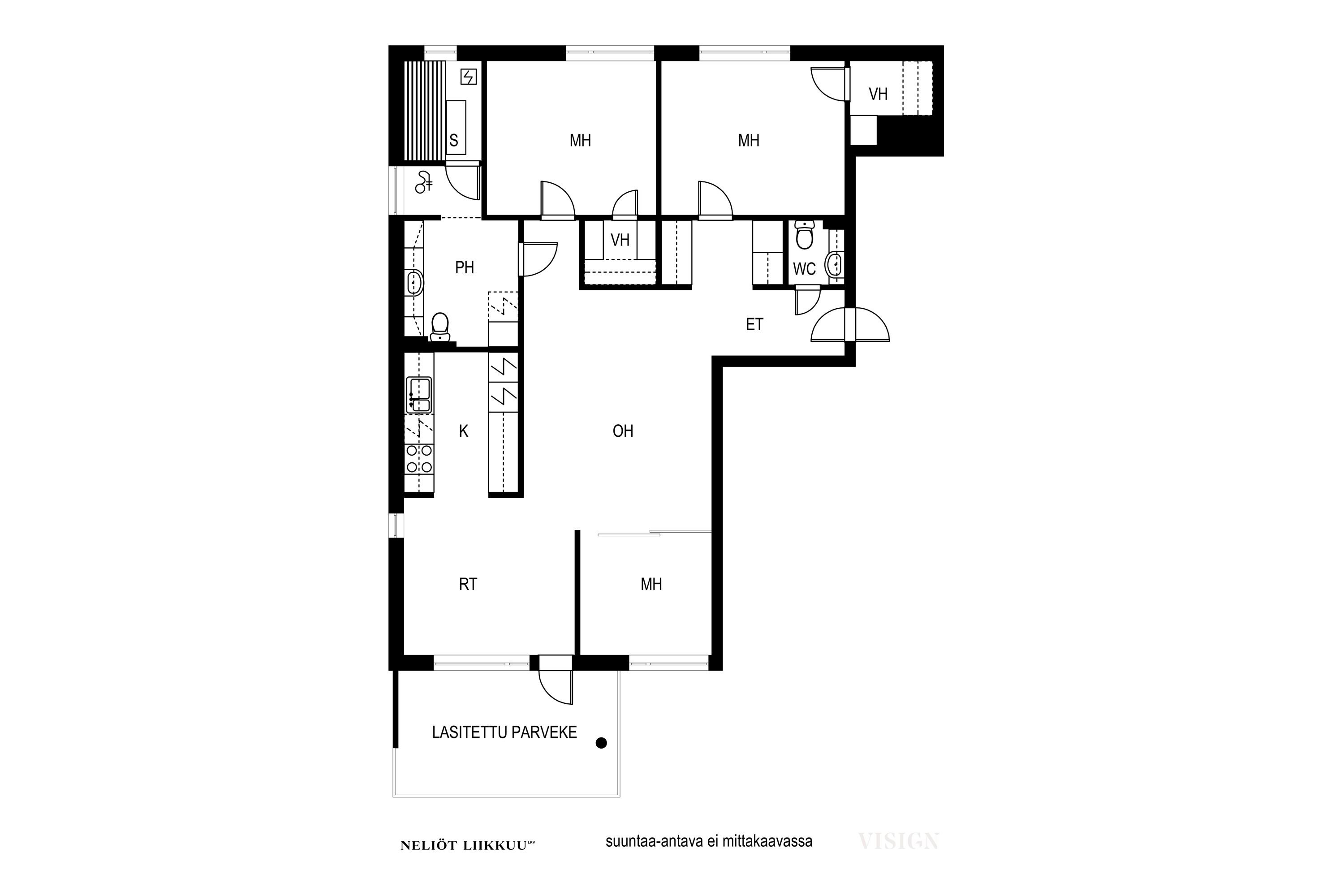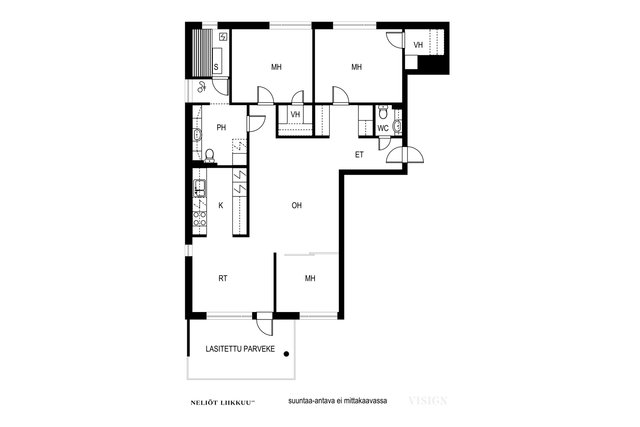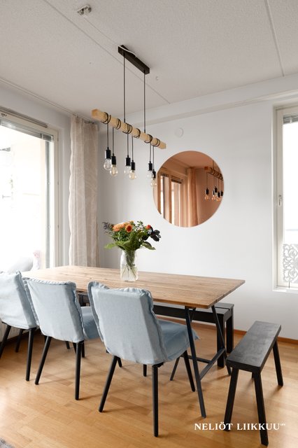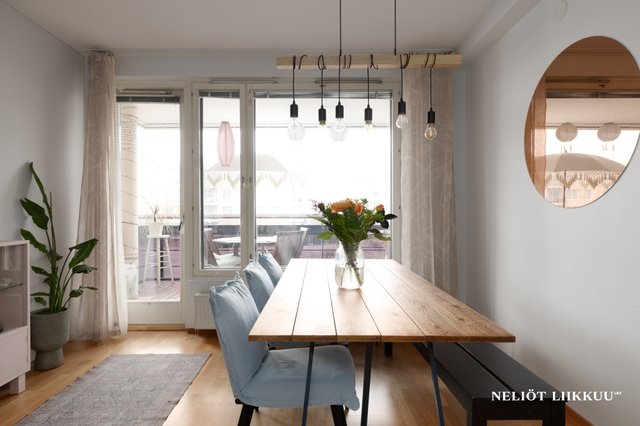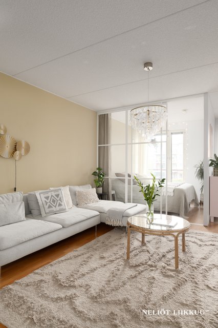 Olohuoneen yhteydessä sijaitsee tyylikäs ja toimiva keittiö, josta löytyy runsaasti kaappi- ja laskutilaa koko perheen tarpeisiin. Asunnossa on kolme tilavaa makuuhuonetta, lasitettu parveke, erillinen wc sekä viihtyisät sauna- ja pesutilat.