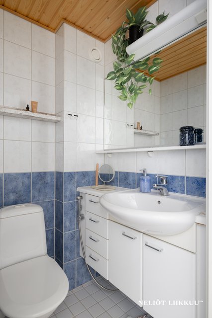 - WC-istuin, suihku, suihkuseinä, pesukoneliitäntä, peilikaappi, pesuallas, ja bidee-suihku
