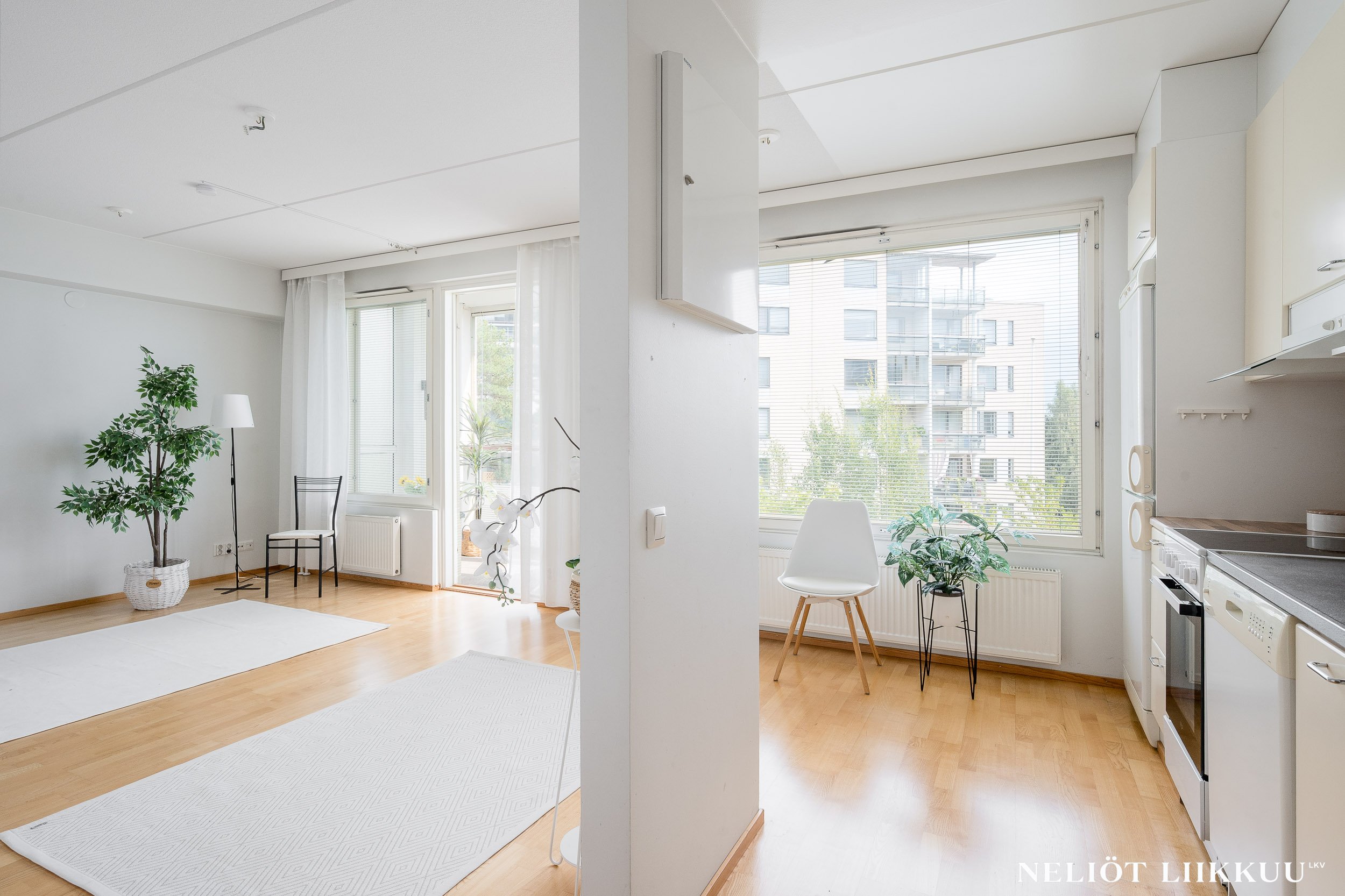 Suositussa MATINKYLÄSSÄ erittäin valoisa asunto, jossa on hyvä avara pohja. Asunto on helppo kalustaa ja sinne mahtuu sekä ruokapöytä, sohva että isompikin sänky. Valoa asuntoon tuo lähes koko seinän levyiset isot ikkunat. Säilytystilaa on reilusti, eteisessä kaapistot ja lisäksi iso vaatehuone. Keittiössä on kaappi- ja laskutilaa sekä astianpesukone. Kylpyhuone on tilava ja siellä on pesukone, joka kuuluu kauppaan. Kirsikkana kakun päällä on tilava lasitettu parveke, josta on kauniit avarat näkymät. Hoitovastike on vain 188,70 euroa (5,10 euroa / m2).