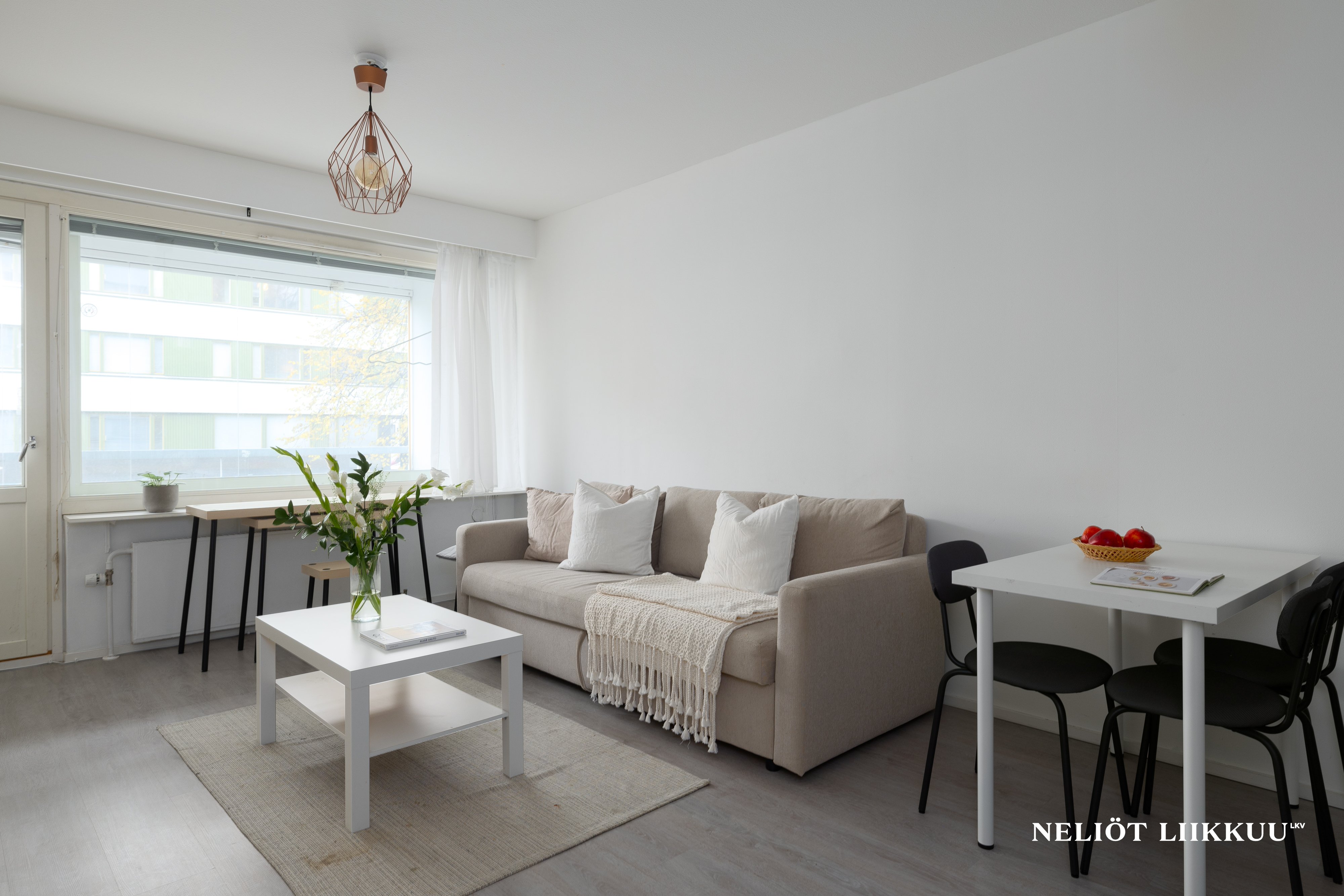 Tilavaan olohuoneeseen mahtuu hyvin ruokailuryhmä sekä sohva, ja sen jatkeena on tilava oma parveke. Avokeittiöstä löytyy tyylikkäät materiaalit, runsaasti kaappi- ja laskutilaa sekä modernit kodinkoneet.