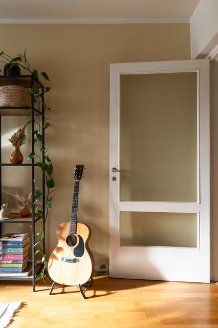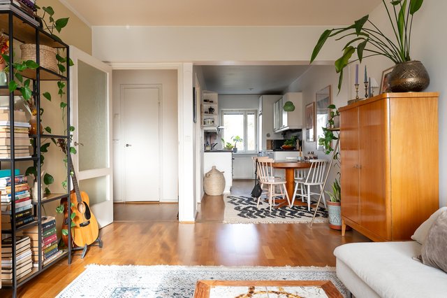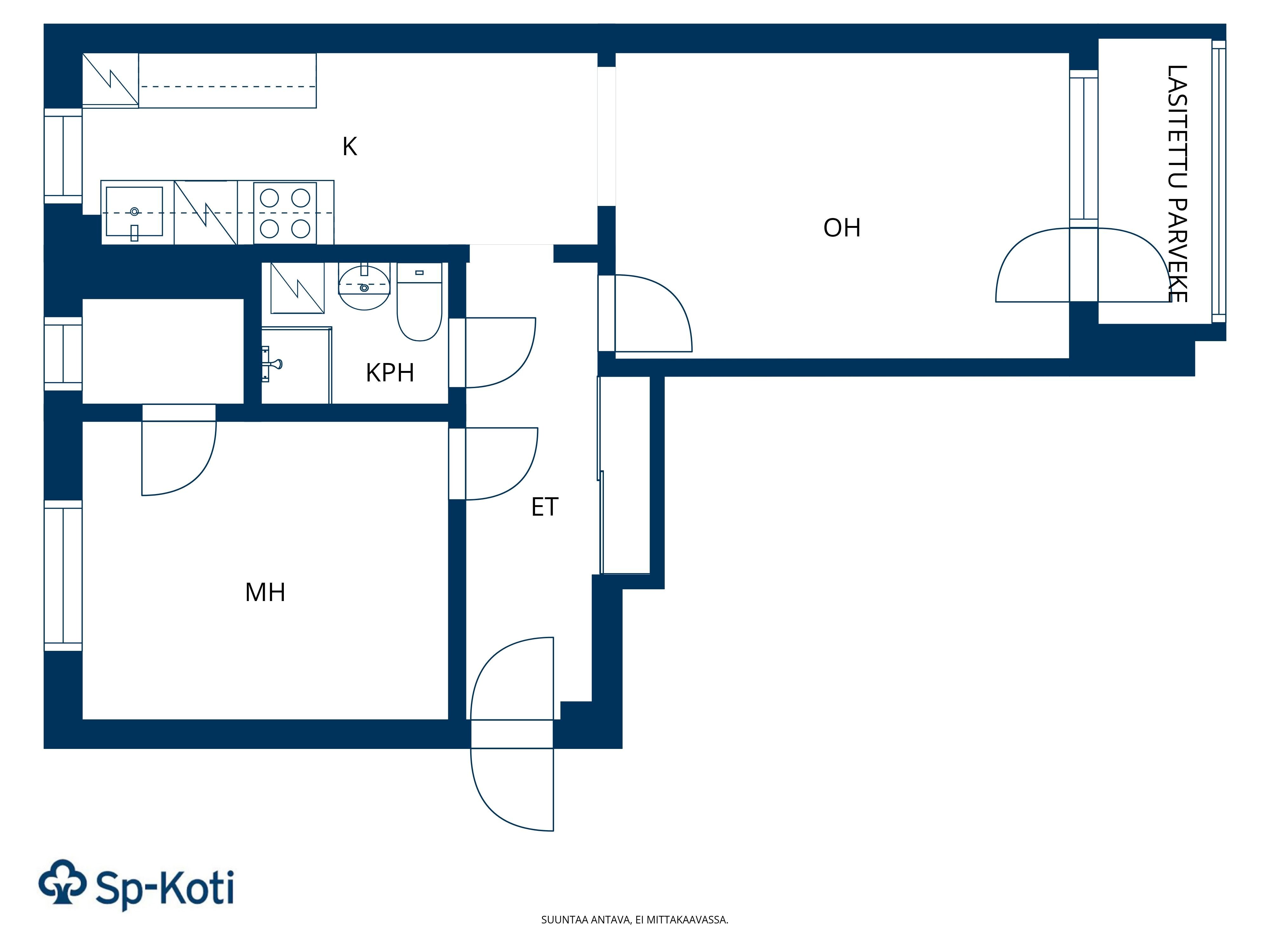- Avara olohuone, josta käynti lasitetulle, aurinkoiselle parvekkeelle. Seinät maalattu, parkettilattia.