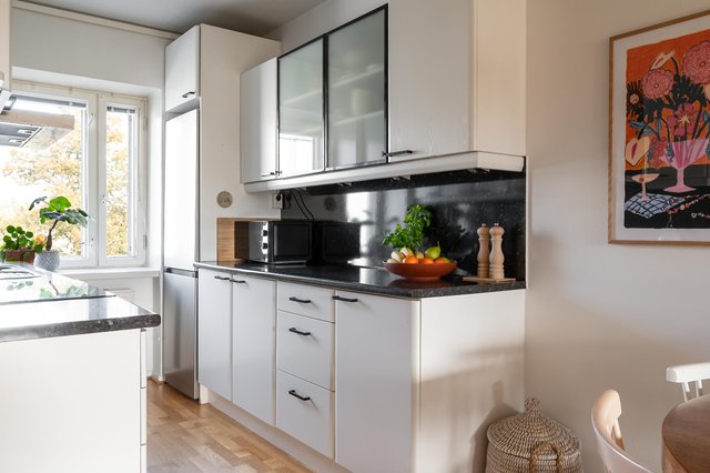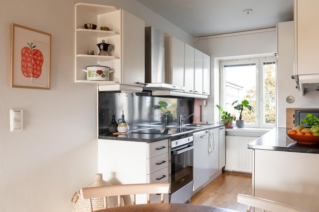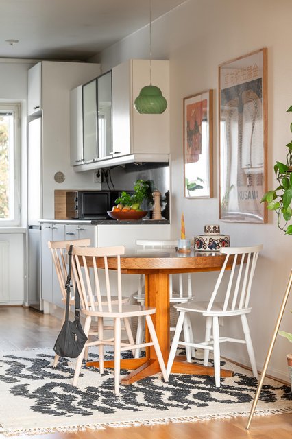Asunnon pohjaratkaisu on toimiva ja kaikelle on paikkansa. Tehokkaasti suunniteltu I-mallinen keittiö tarjoaa runsaasti säilytys- ja työtilaa kahdella seinustalla, ja päädyssä oleva ikkuna avaa näkymän vastapäiselle puistopihalle. Keittiön jatkeena on ruokailutila.