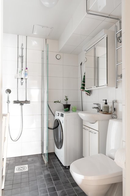 - Kylpyhuone remontoitu vuonna 2017 LVIS-saneerauksen yhteydessä. Suihku, taittuvat suihkuseinäkkeet, wc, bidee, allaskaappi, peilikaappi, pyyhekuivain, pk-liitäntä, sähkötoiminen mukavuuslattialämmitys. Valkoinen seinälaatta ja harmaa lattialaatta.