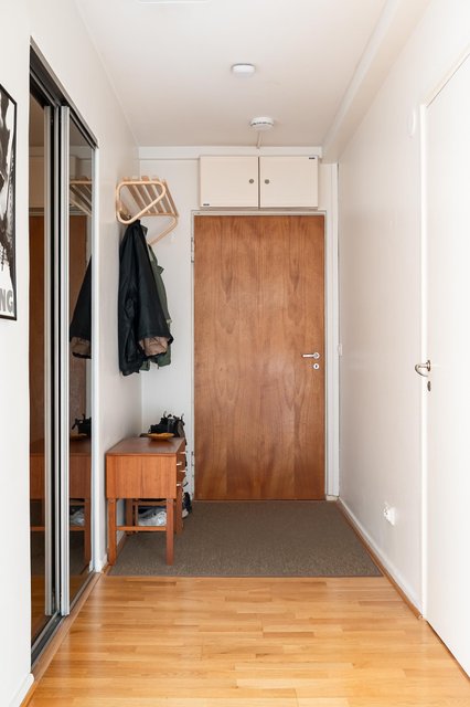 - Eteisessä liukuovikaapisto. Seinät maalattu, parkettilattia.