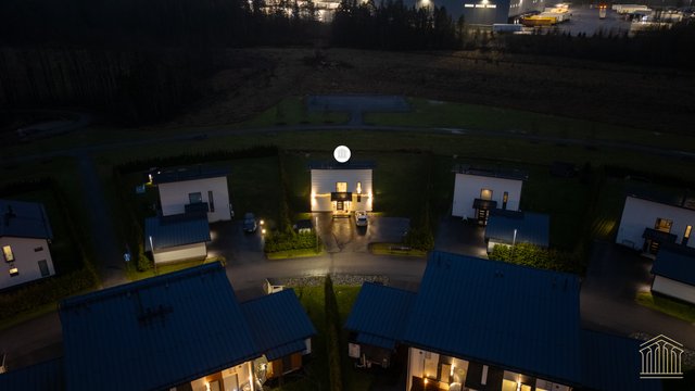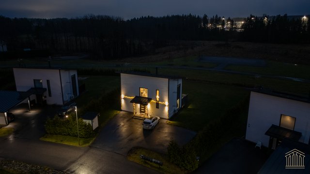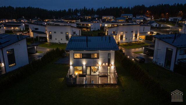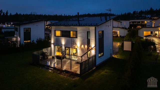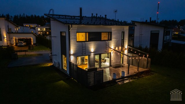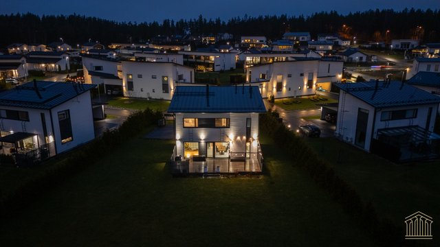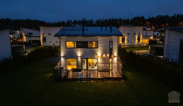 Sisään astuessa avautuu talon sydän eli avara olohuoneen, ruokailutilan ja keittiön yhdistämä tila, josta avautuu isot ikkunat takapihalle kohti puistoksi kaavoitettua takapihaa, jossa naapurin ikkunat eivät häiritse. Käytännöllisyys on otettu huomioon materiaalivalinnoissa - eteisessä laattalattia johdattaa suoraan kylpyhuoneeseen sekä alakerran erilliseen wc:hen. Näin toiminnallinen arki lasten ja kotieläimien kanssa sujuu ongelmitta. Alakertaan lisäulottuvuuden tuo valtava 40 m2 terassi, jossa mahtuu olemaan isompikin ruokailuryhmä, terassikalusteet ja grilli. Mikään ei estä asentamasta terassille myöskään ulkoporeallasta.