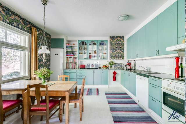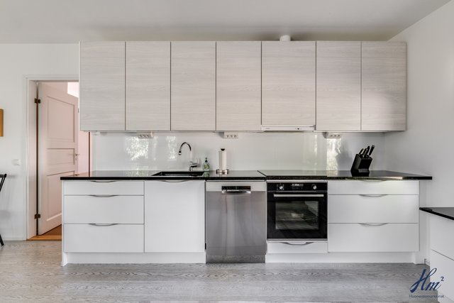 - Asunto 1: Jääkaappi, pakastekaappi, astianpesukone, kalusteuuni, induktioliesi, liesituuletin, aamiaiskaappi. Työtasot kiveä. Asunto 2: Jääkaappi/pakastin, astianpesukone, uuni ja sähköliesi, liesituuletin.