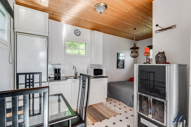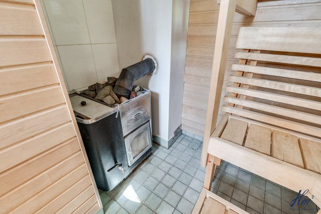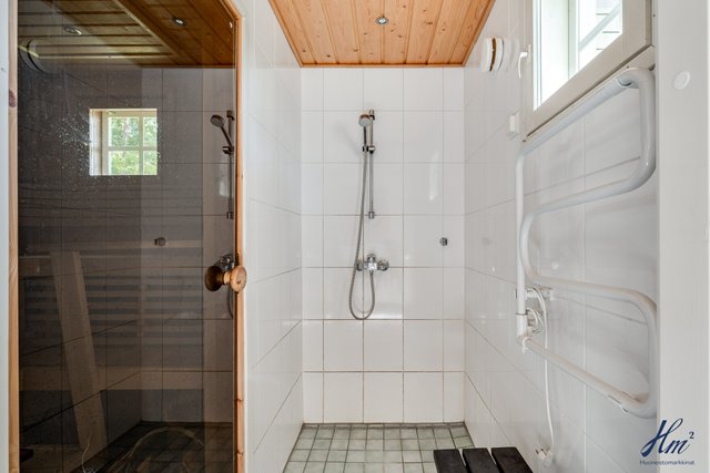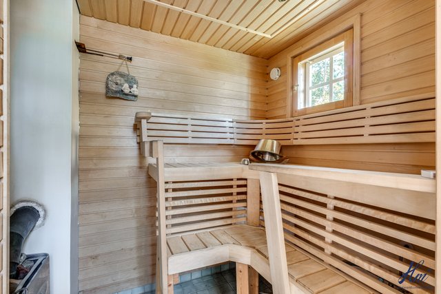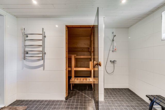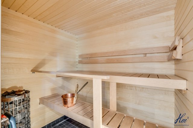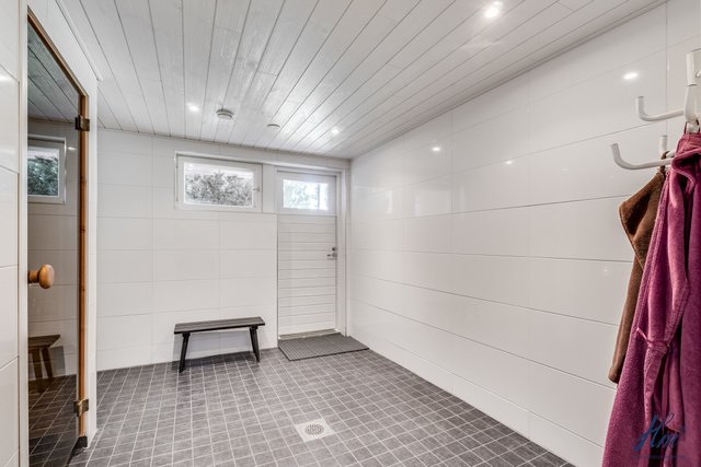 - Molempien asuntojen sauna kellarikerroksessa. Saunoissa sähkökiuas ja asunnossa 2 myös ikkuna. Rannassa erillinen pihasauna, jonka yhteydessä pesuhuone ja saunassa puukiuas.
