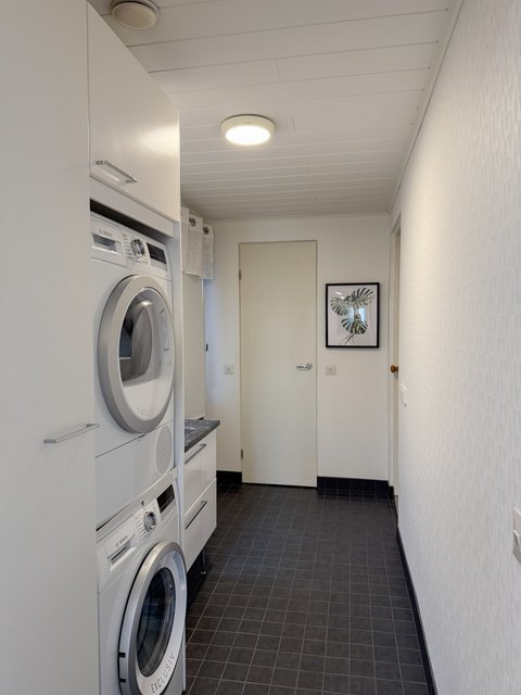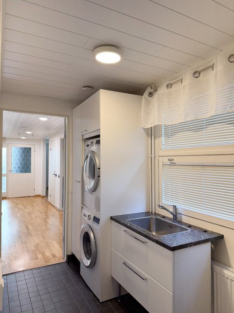 - Pesukoneliitäntä, tila pesutornille, pöytätaso, pesuallas, ja pyykkikaapit