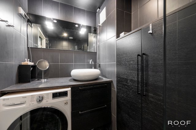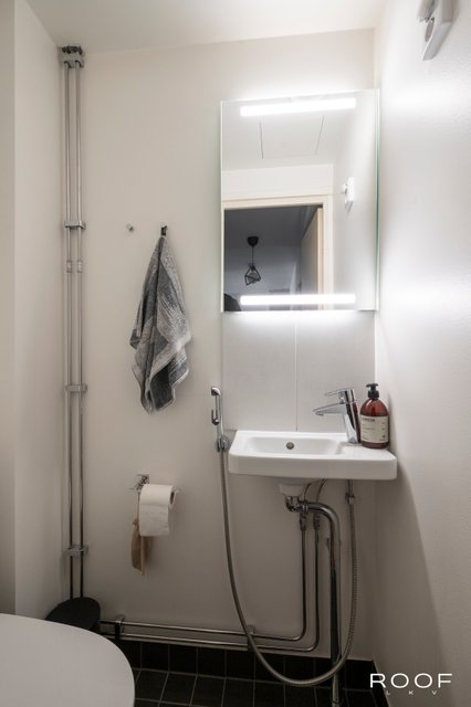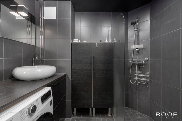 - Suihku, suihkuseinä, pesukoneliitäntä, peili, allaskaappi, ja pesuallas
