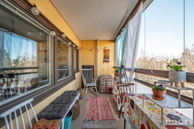 Asunnossa on kaksi makuuhuonetta, joissa on kiinteät kaapit säilytykseen. Olohuone on avara ja valoisa. Olohuoneen yhteydessä on hyvin tilaa isolle ruokapöydälle. Keittiö on hyvin varusteltu on ja siellä on runsaasti säilytystilaa. Kylpyhuoneessa on tilaa pesukoneelle ja erillinen wc lisää asunnon toimivuutta. Lasitettu parveke tarjoaa lisätilaa ja toimii vuoden ympäri viihtyisänä oleskelualueena. Asunto sijaitsee talon ylimmässä kerroksessa, mikä takaa rauhallisen asumisen.