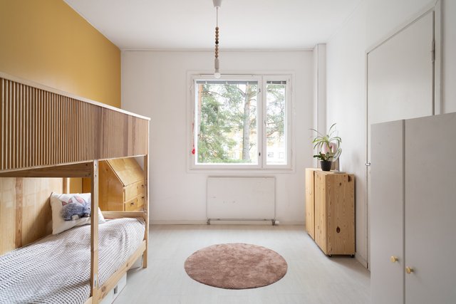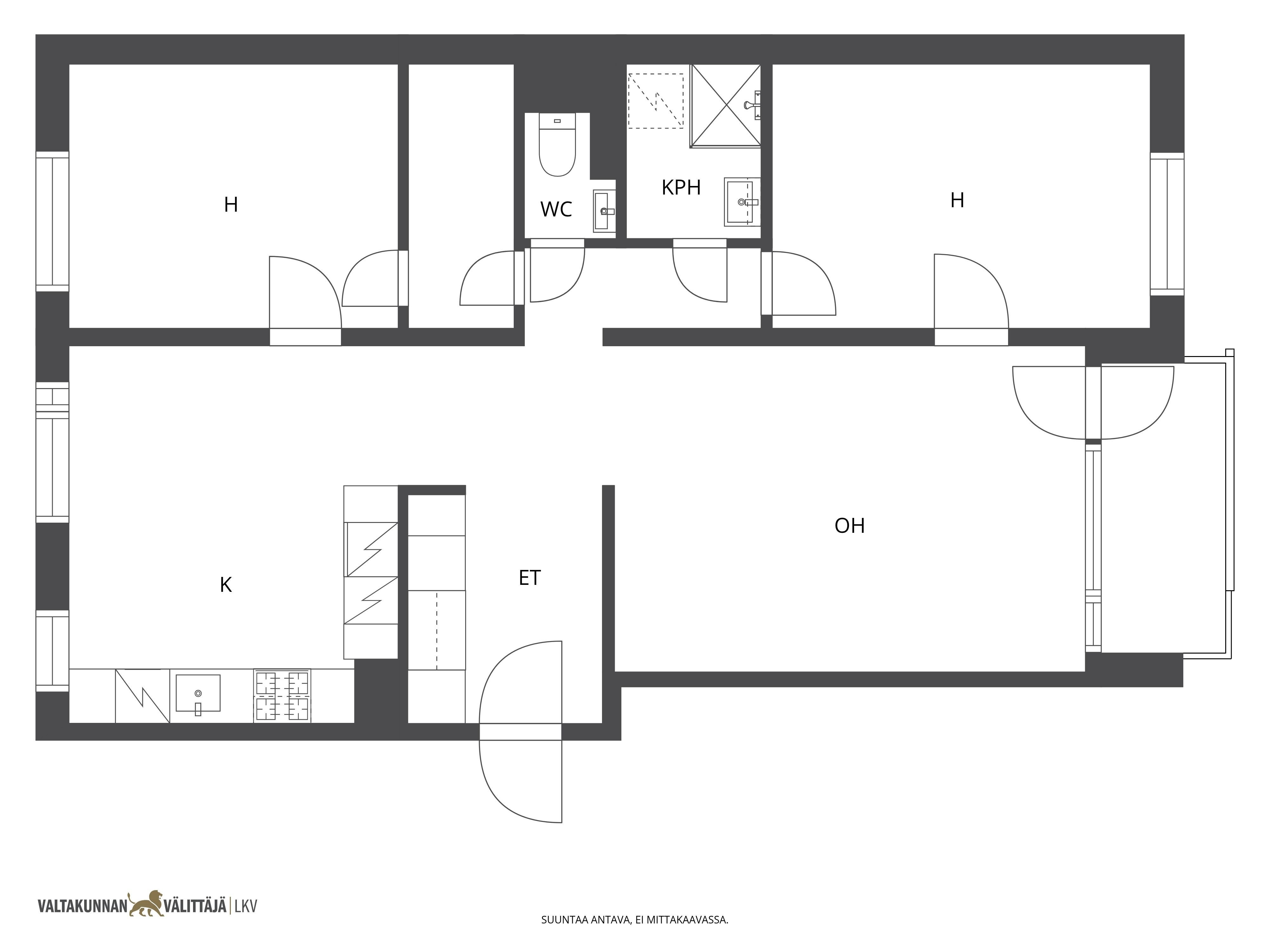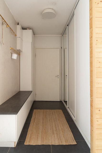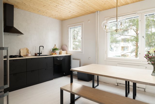 Rauhallisen harmoninen keittiö, jossa mustat kaapistot ja vaalea puutaso muodostavat ajattoman parin. Selkeä tilaratkaisu tarjoaa runsaasti laskutilaa ja paikan suuremmallekin ruokailuryhmälle. Olohuone on tilava ja ikkunasta tulvii valoa koko päivän. Olohuoneesta käynti lasitetulle parvekkeelle. Asunnossa on kaksi fiksunkokoista makuuhuonetta. Säilytystilasta ei ole puutetta vaatehuoneen ja kaapistojen ansiosta. Kylpyhuoneessa on tilaa pesutornille, ja erillinen wc sujuvoittaa koko perheen arkea.