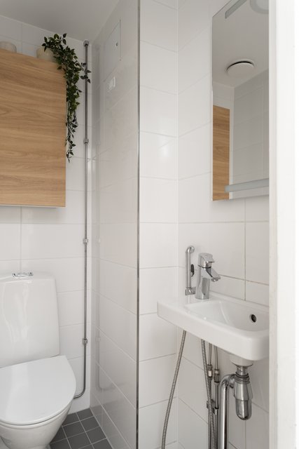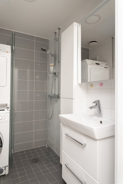 - Suihku, suihkuseinä, pesukoneliitäntä, peilikaappi, pesuallas, ja allaskaappi