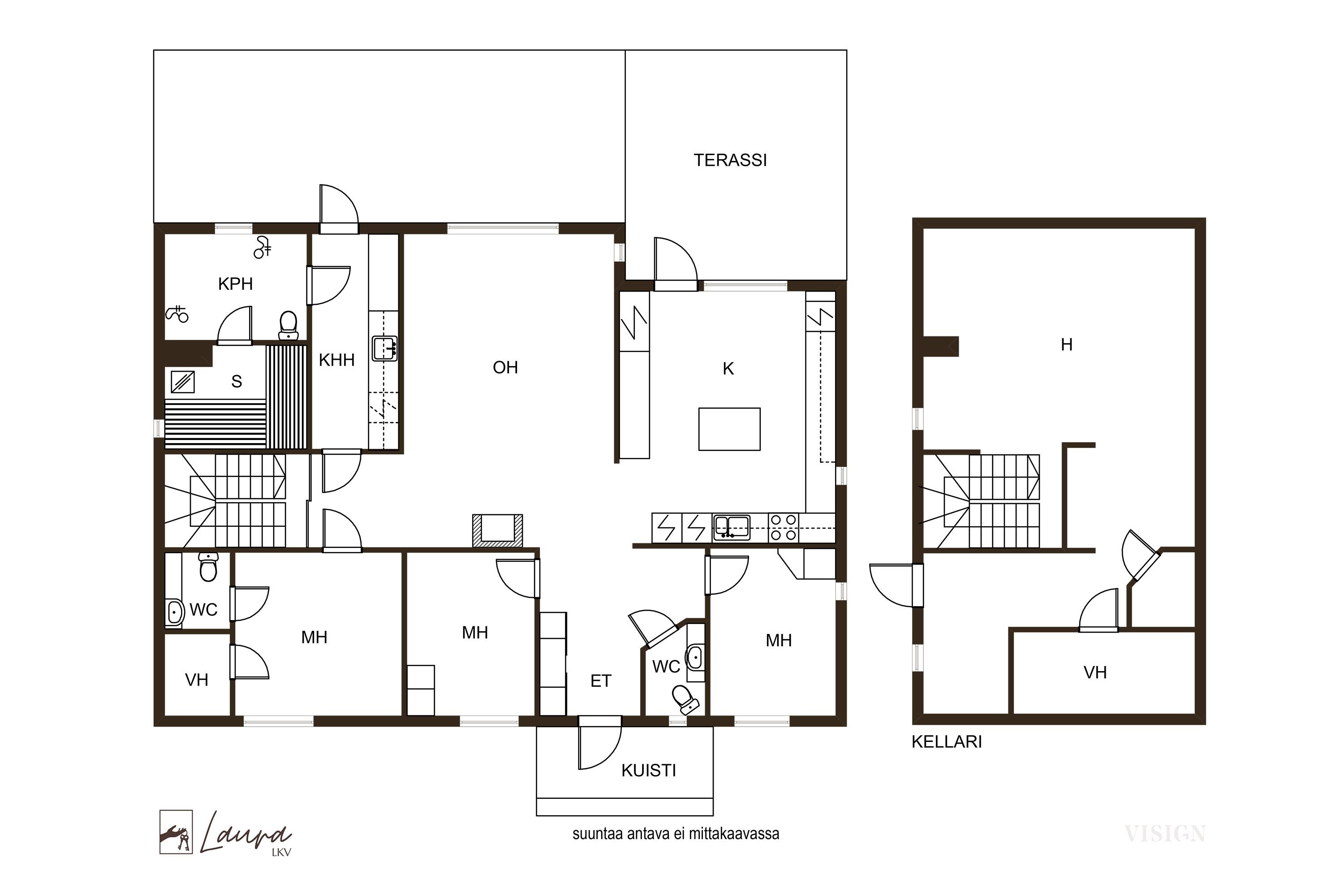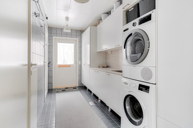 - Pesukoneliitäntä, lattialämmitys, tila pesutornille, lattiakaivo, pöytätaso, pyykkikaapit, ja pesuallas
