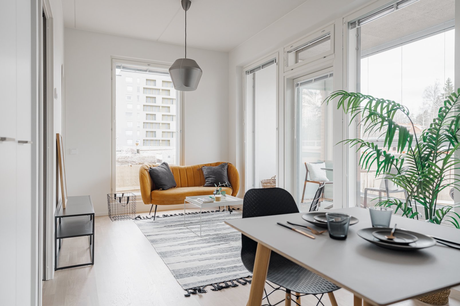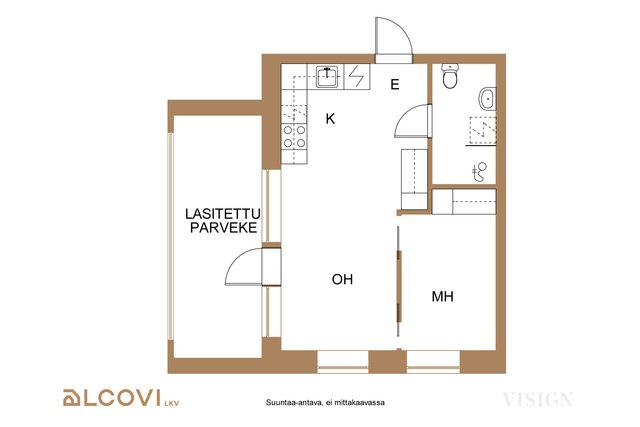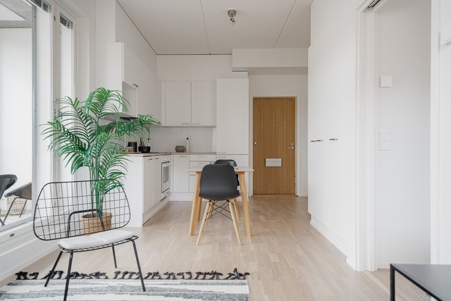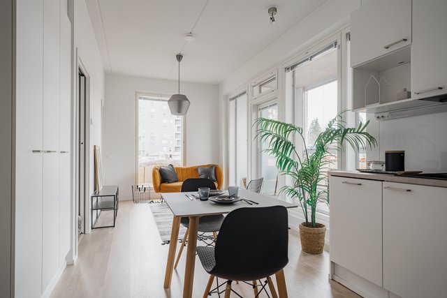 Tyylikäs avokeittiö yhdistyy luontevasti oleskelutilaan, ja avokeittiöstä löytyy kaikki tarvittavat toiminnot sujuvaan ruoanlaittoon. Myös ruokailuryhmälle on luontainen paikkansa. Makuuhuoneessa sekä eteisessä on mukavasti säilytystilaa. Ajattomin sävyin viimeistelty kylpyhuone on tilava ja soveltuu erinomaisesti myös pyykkihuoltoon. Asumisviihtyvyyden kruunaa reilun kokoinen, noin 10 m² lasitettu parveke, joka tarjoaa lisätilaa pitkälle syksyyn.