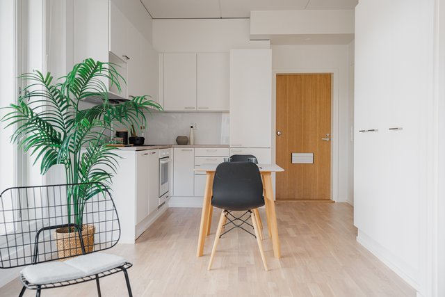 - Avokeittiön varustukseen kuuluu induktioliesitaso, liesituuletin, uuni, jääkaappi-pakastin ja astianpesukone. Lattia on parkettia, seinät maalatut.
