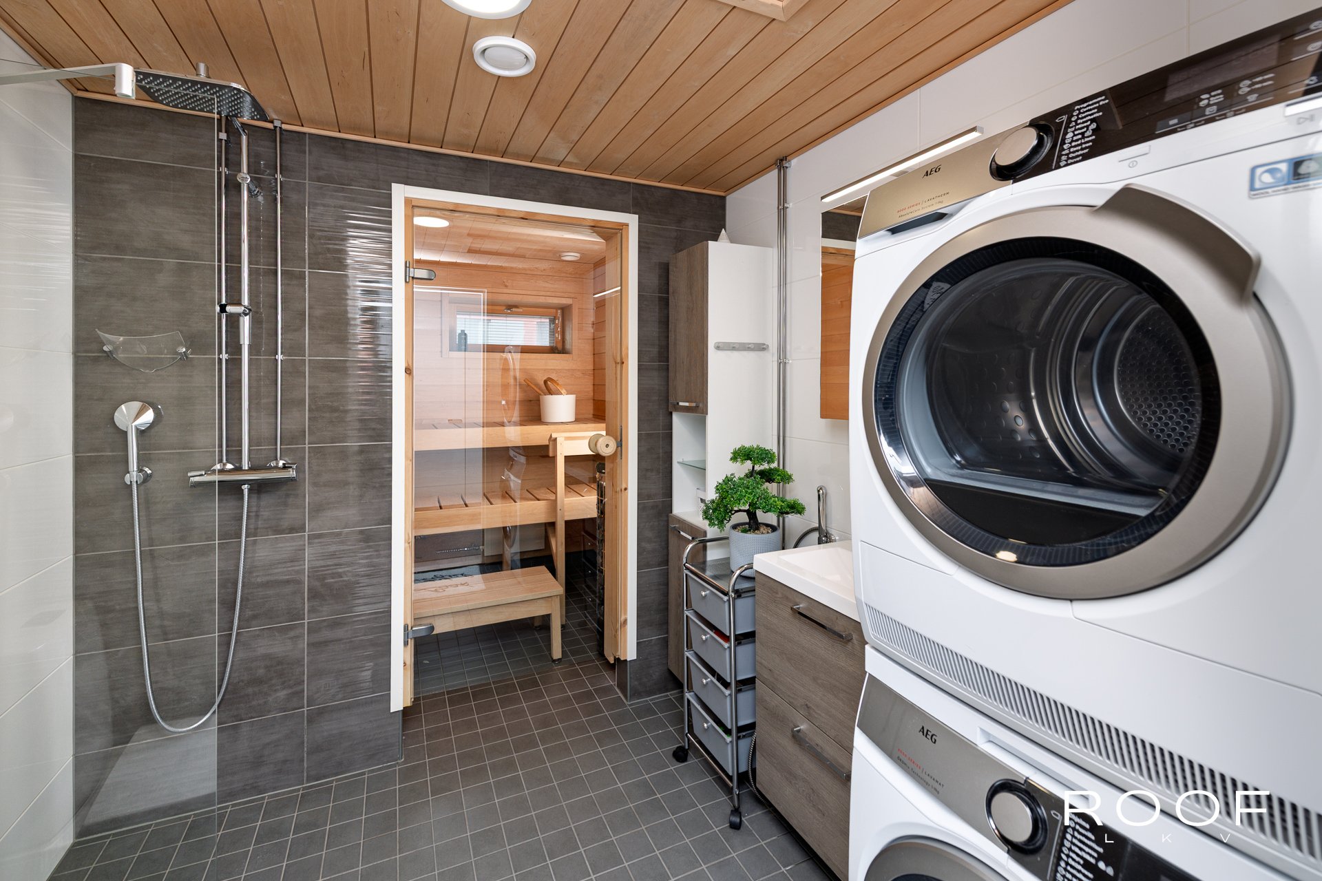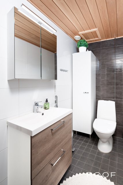 - Kylpyhuoneen yhteydessä pesukoneliitäntä ja kaapistoja.
