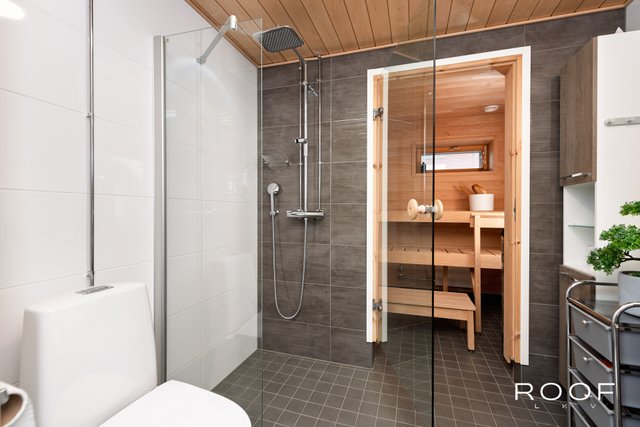 - Wc-istuin, allaskaluste, bidee, suihkuseinä, peilikaappi, pesukoneliitäntä, lattia ja seinät laatoitettu, lattialämmitys.
