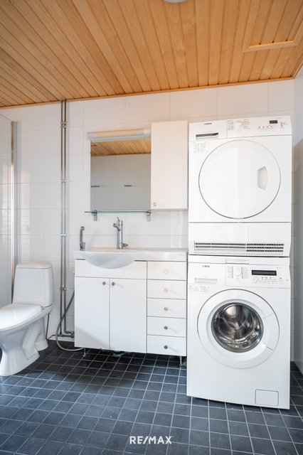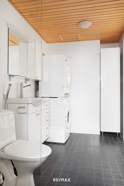- WC-istuin, suihku, suihkuseinä, pesukone, kuivausrumpu, pesukoneliitäntä, pesuallas, allaskaappi, peili, bidee-suihku, seinäkaappi, ja lattialämmitys