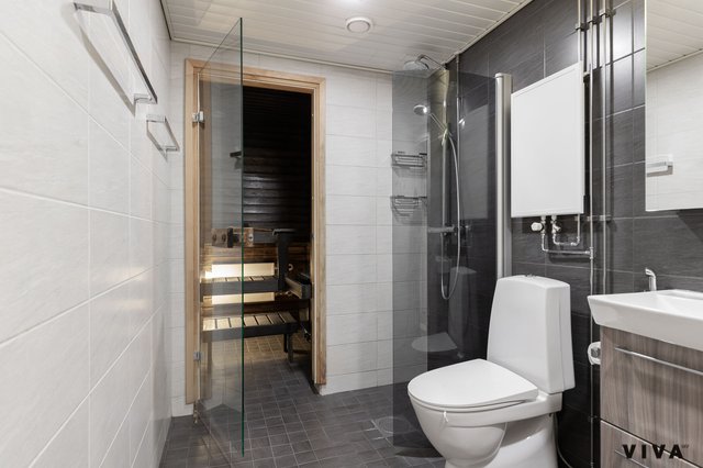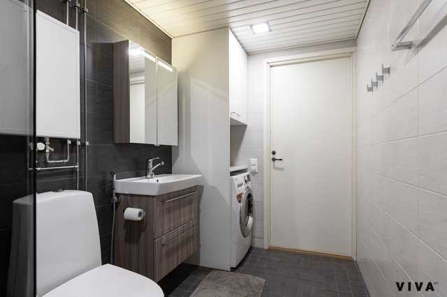 - WC-istuin, suihku, suihkuseinä, pesukoneliitäntä, peilikaappi, pesuallas, allaskaappi, ja bidee-suihku