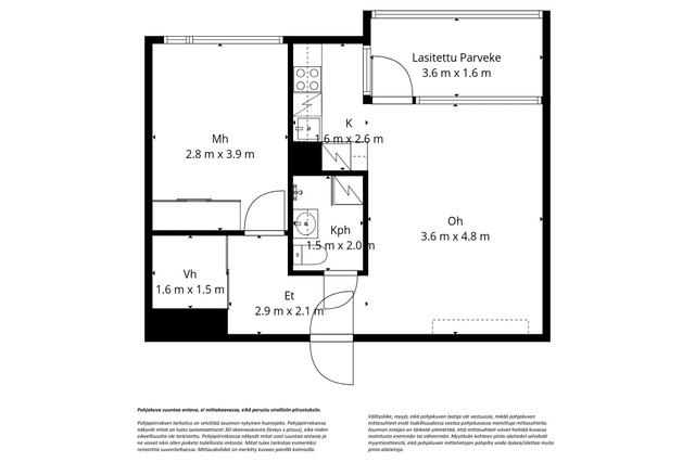 - Ei tarkistusmitattu. Pinta-alat saattavat tämän ikäisissä kohteissa (yhtiö rekisteröity ennen 01.01.1992) poiketa olennaisestikin asuinrakennusten nykyisten mittaustapojen ja standardien (SFS 5139) mukaan laskettavasta asuintilojen pinta-alasta. Pinta-ala voi siis olla edellä mainittua pienempi tai suurempi.