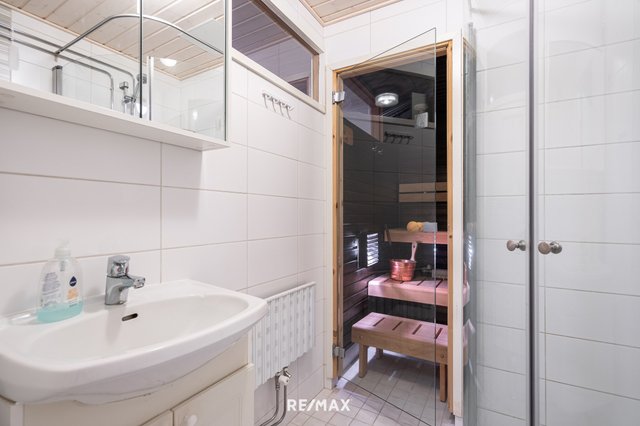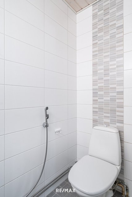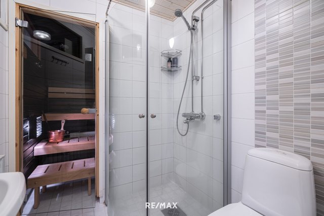 - WC-istuin, suihkuseinä, lattialämmitys, allaskaappi, pesuallas, peilikaappi, bidee-suihku, ja suihku