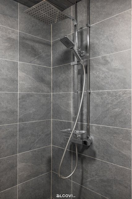 - Kylpyhuoneen varustukseen kuuluu allaskaappi, pyöreä peili, sadesuihku, pyykinpesukoneliitäntä, lattialämmitys (sähkö) ja naulakko. Lattia on laattaa, seinät kaakelia ja katto paneloitu. Kiinteä valaistus.