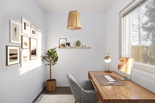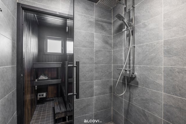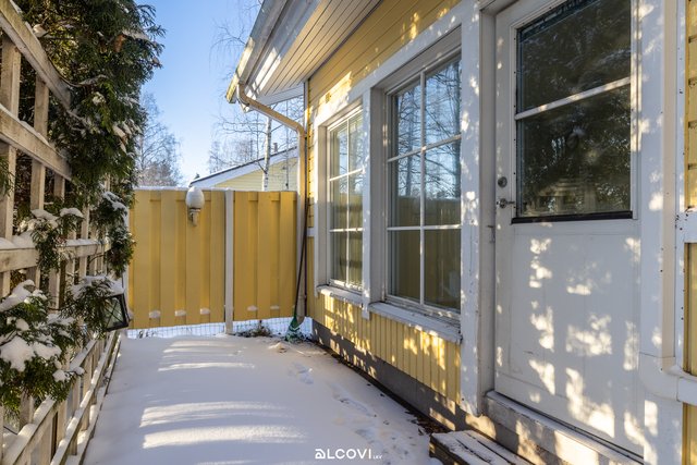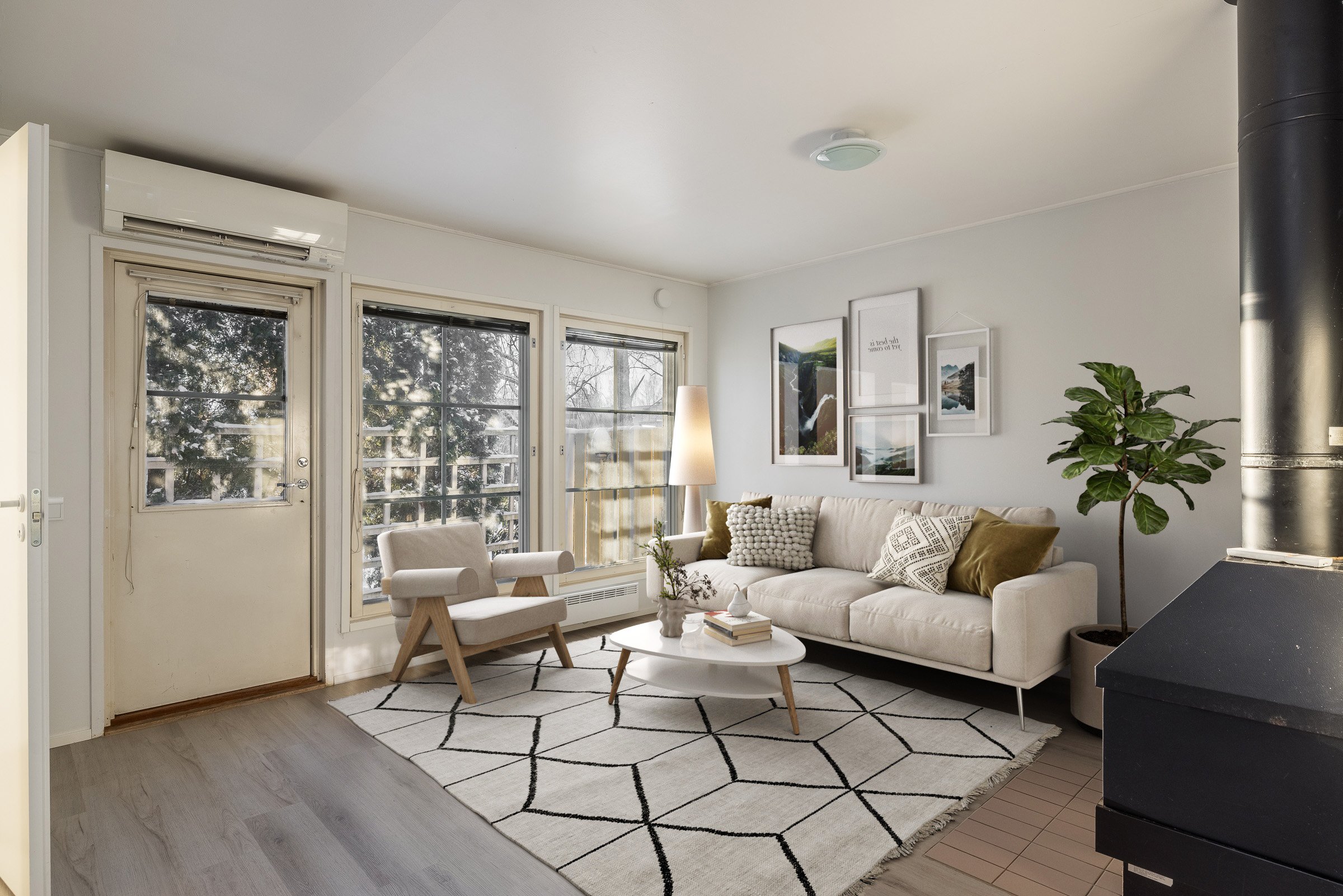 Saarekkeellinen avokeittiö on tyylikäs ja kattavasti varusteltu, myös ruokailuun on tilaa. Takka tuo olohuoneeseen sekä tunnelmaa että lämpöä, ja tilojensa puolesta olohuoneen voi kalustaa useammallakin eri tavalla. Olohuoneesta on suora käynti suojaisalle piha-alueelle, joka kutsuu viihtymään. Päämakuuhuoneeseen sopii vaivatta parisänky, lisäksi kodista löytyy kompakti tila, joka taipuu esimerkiksi työskentelyyn tai vaikkapa pienen lapsen huoneeksi. Kylpyhuone ja sauna hurmaavat laadukkailla materiaalivalinnoillaan ja huolitellulla viimeistelyllään. Pyykkihuollolle on oma paikkansa, ja lattialämmitys lisää arjen mukavuutta. Erillinen wc sijaitsee kätevästi eteisen yhteydessä.