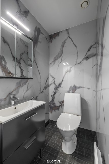 - Erillisen wc:n varustukseen kuuluu allaskaappi, valaistu peilikaappi, wc-istuin ja bidee-suihku. Lattia on laattaa, seinät sisustuslevyä ja katto maalattu.