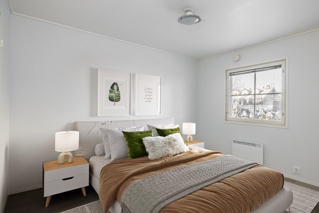 - Makuuhuoneiden lattiat ovat vinyyliä, seinät maalattua levyä. Päämakuuhuoneen yhteydessä on vaatehuone. Olohuoneen yhteydessä oleva huone on kompakti (noin 5 m2).