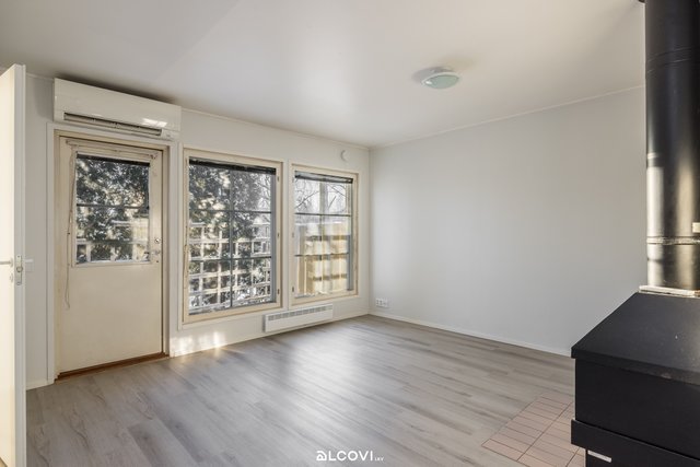 - Olohuoneen lattiat ovat vinyyliä, seinät maalattua levyä. Takka. Ilmalämpöpumpun sisäyksikkö. Kulku pihalle.