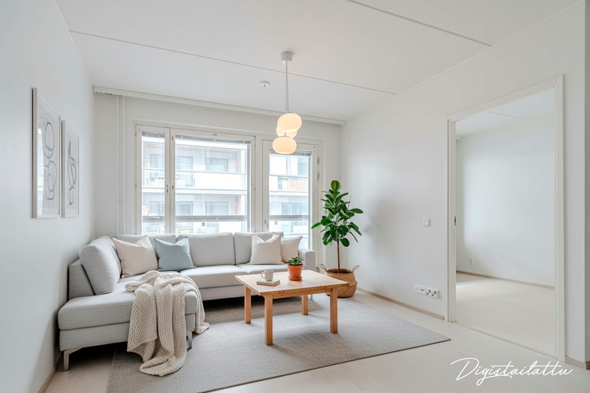 - Olohuoneessa avara tunnelma isojen ikkunoiden johdosta. Koko huoneiston levyinen parveke jonne pääsy olohuoneesta.